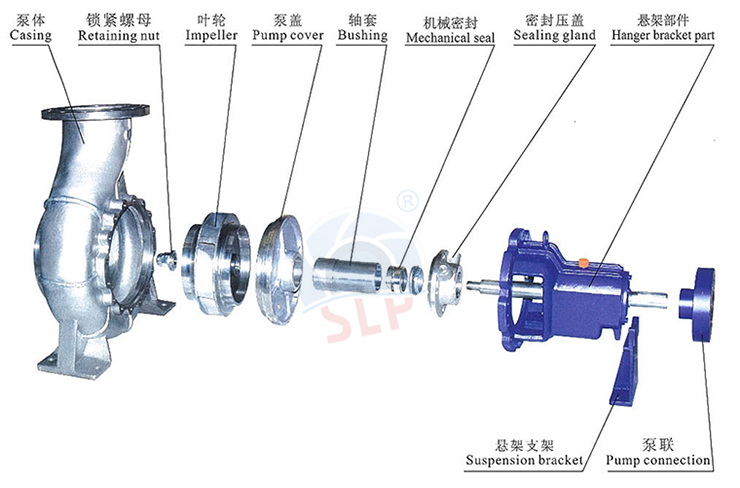 作用于轴封处的压力由副叶片或叶轮上的平衡孔平衡。轴封既可采用软填料密封(可冷却,也可不冷却),也可采用各种结构的单、双端面机械密封(可采用平衡型)。滚珠轴承经久耐用,轴径尺寸充裕,以保证运行平稳。部分规格的泵体设计成双蜗壳体,以平衡径向力。轴承架,包括轴、叶轮、填料函等形成一个组合部件,使泵体在维修时不需从管道上拆下(如果采用加长联轴器时,电机也不必拆下)。法兰依据材料的差别,采用PN16、PN25两种设计,也有ANSI 125 Lbs或150 Lbs的设计。