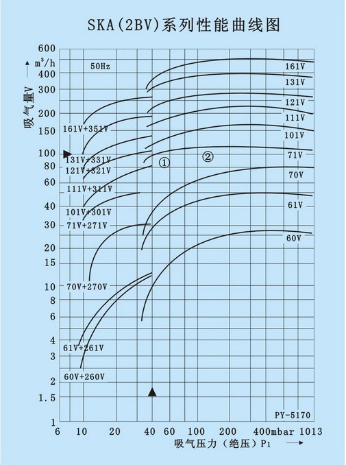 2BV系列水环式真空泵,也称为SKA系列水环真空泵,吸气压力可达33mbar绝压(97%真空度)。当真空泵在吸气压力低于80mbar的状态下长期工作时,应连接气蚀保护管对泵进行保护,如配大气喷射器吸气压力可达10mbar,喷射泵可直接安装在真空泵上,作为压缩机使用时,其压力最大至0.26mbar(绝压)。